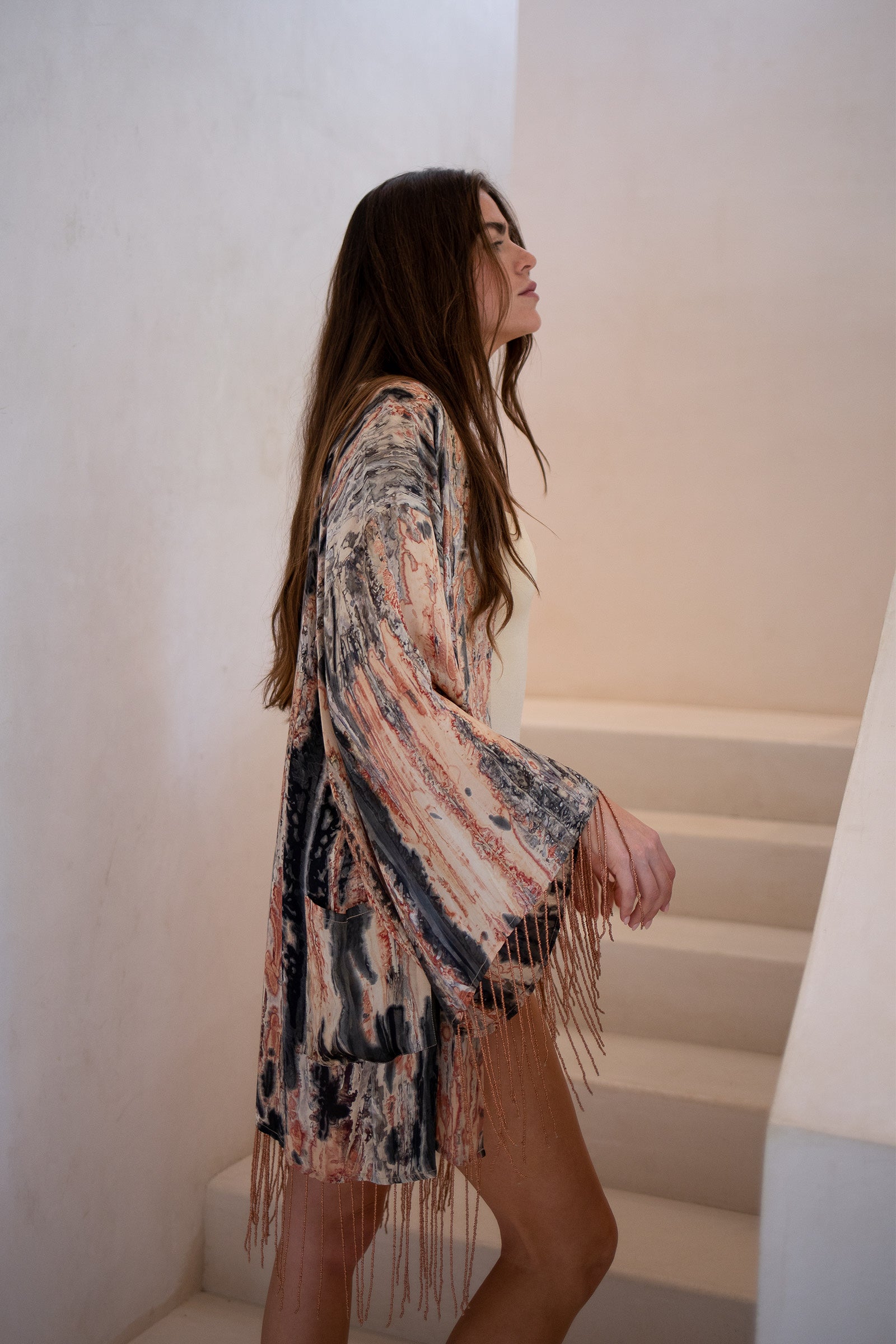 Hand dip dyed bamboo satin with hand beaded detail. Belt included