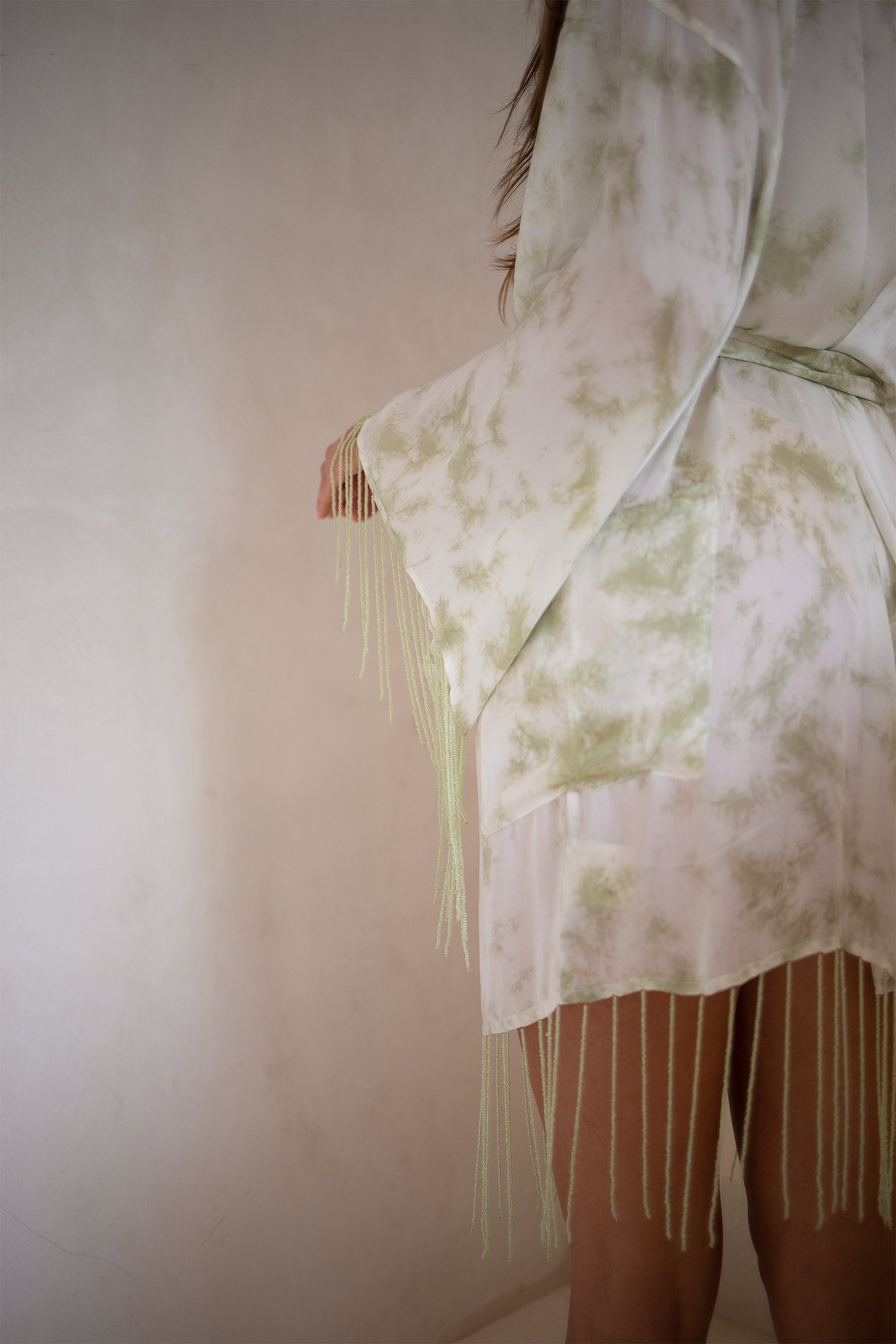 Hand dip dyed bamboo satin with hand beaded detail. Belt included